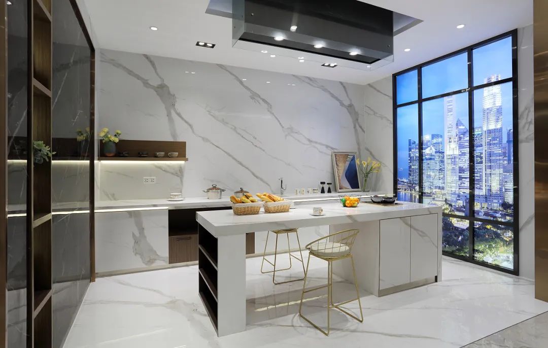 巖板具有[敏感詞]的抗高溫、抗高壓、防水防火防腐蝕防變形的作用,是可以直接接觸食品的安全材料,兼具美感和實用性,因此巖板是高端廚房理想的臺面材料。